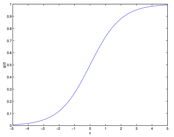- 여기서 g(z)는 sigmoid function 또는 logistic function이라고 불린다.(굳이 이함수를 이용하는 이유는 lecture4에서 나온다.)