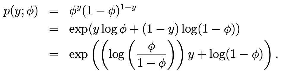 - y | x ~ Bernoulli(phi)를 가진다고 생각할 수 있다.