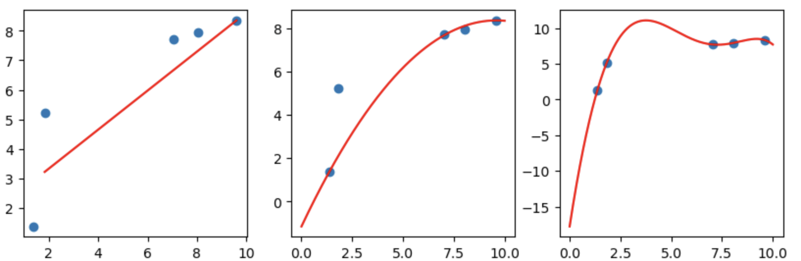 - 첫번째 일차함수 같은 경우 데이터를 덜 설명하게 된다. 이를 Under fitting이라고 한다.(High bias를 가진다.)