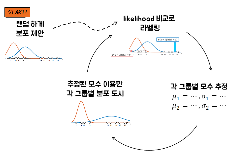 - EM Algorithms은 iterative algorithm으로 두 가지 주요 단계로 주어진다.
