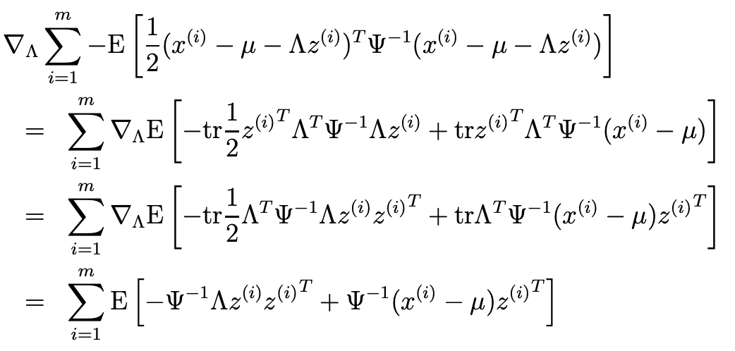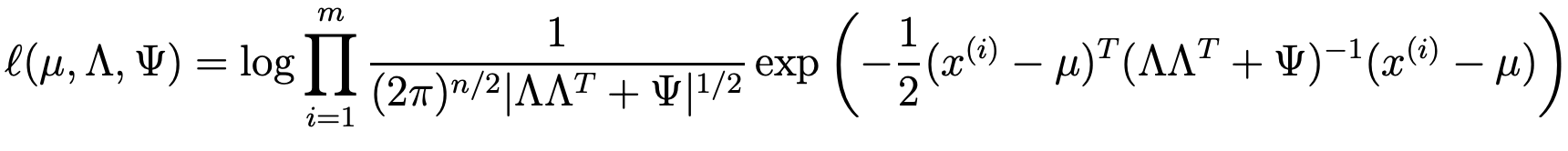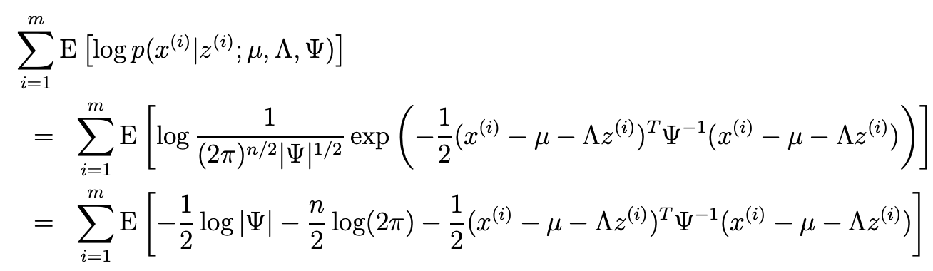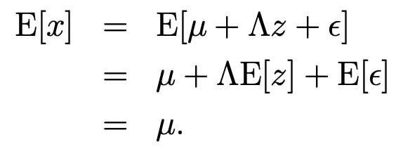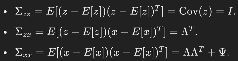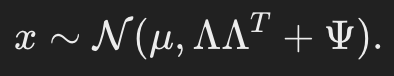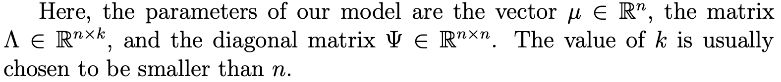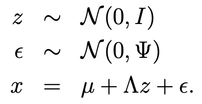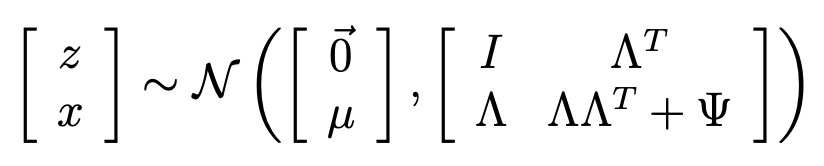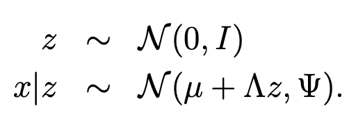 - factor analysis model에선 (x,z)의 joint distribution을 다음과 같이 정의한다.( z는 k차원의 latent variable)