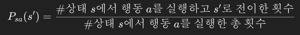 - 이러한 MDP 경험이 주어지면, 우리는 state transition probability를 MLE를 통해 다음과 같이 계산이 가능하다.