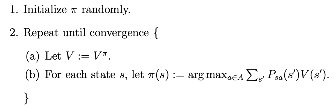 - Loop에선 현재 policy에 대한 value function V를 계산한 후, 그에 따라 policy를 업데이트하는 과정을 반복한다.