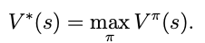 - 여기서 우리는 Optimal value function을 정의할 수 있는데, V^ㅠ의 max값으로 정의 된다.