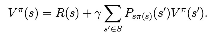 - 특히, 공간이 유한한 MDP에서는 이를 |S|개의 선형 방정식을 |S|개의 미지수(V^ㅠ(s))에 대해 풀어야 하는 문제가 된다.