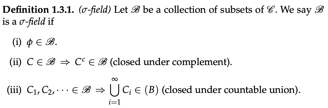- C를 sample space라고 정의하고, B를 event들의 집합이라고 하자.