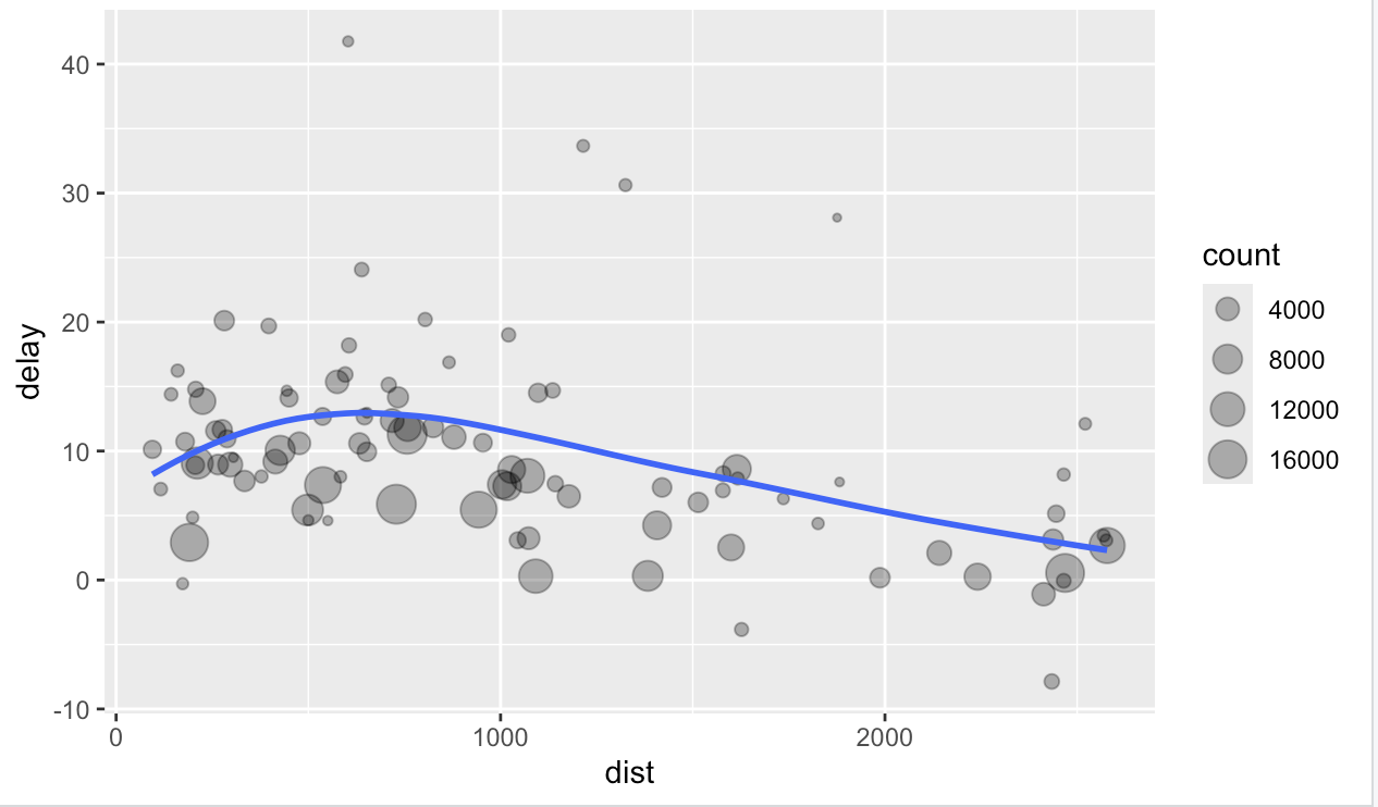 ggplot(data = delay, mapping = aes(x = dist, y = delay)) +