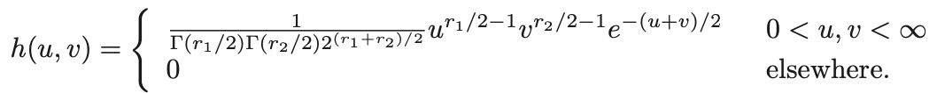- 두 개의 도립적인 chi-square R.V U와 V가 각각 자유도 r1과 r2를 가진다고 가정하자.