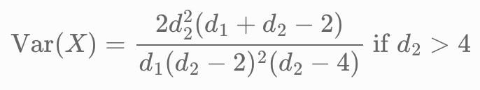 - Variance of F-distribution은 다음과 같이 주어진다.(mgf를 통해 구할 수 있음)