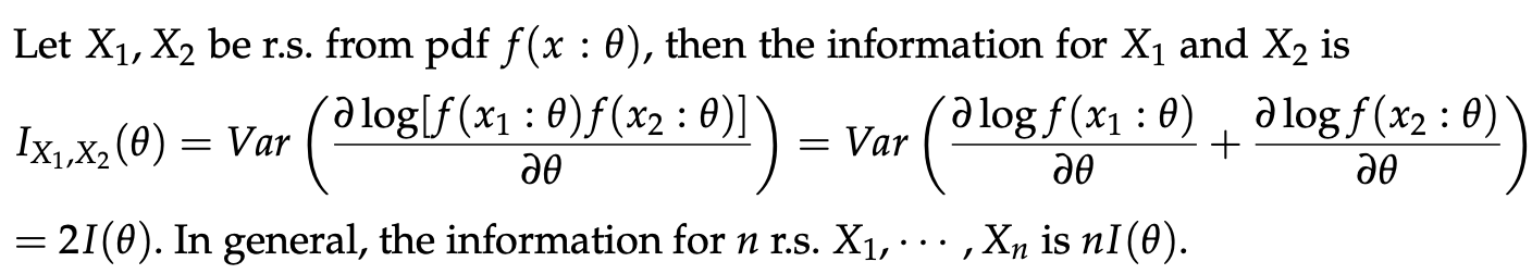 - Fisher information도 joint 한 Random Sample에 대하여 다음과 같이 계산 가능하다.