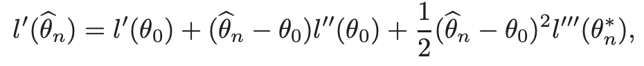 l'(theta)를 theta_0을 중심으로 2차 테일러 급수로 전개하여, theta^에 대해 다음과 같아진다.