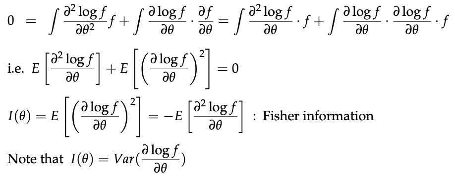 - 마지막 I(theta) = Var(~~) = E(~~^2) - E(~~)^2 = E(~~^2) - 0 으로 유도 가능하다.