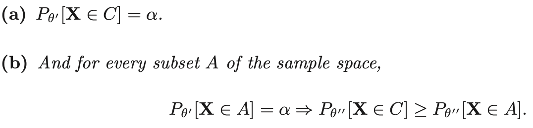 - c가 alpha를 가지는 "best critical region"이라고 정의되려면 다음 조건을 만족해야 한다.