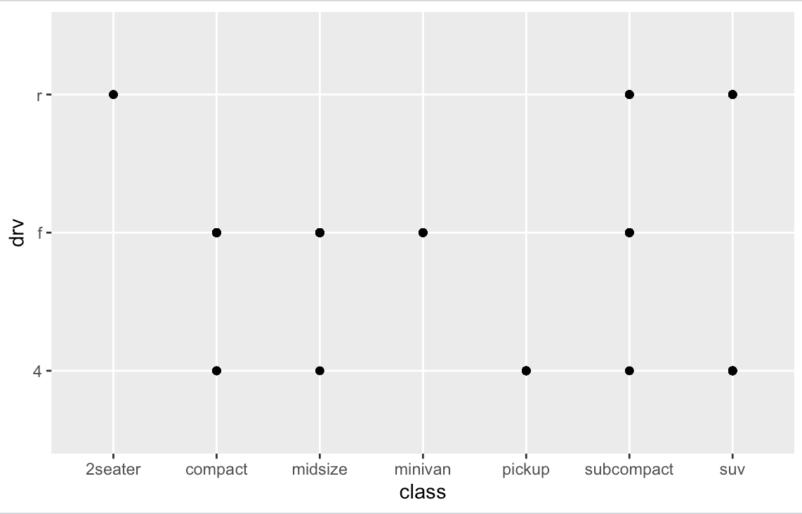 geom_point(mapping = aes(x=class,y=drv))