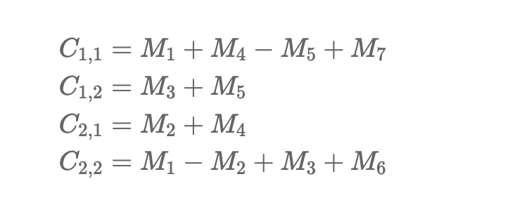 - 이를 C11,C12,C21,C22의 부분행렬들을 M1~7까지를이용하여 나타내면 다음과 같다.
