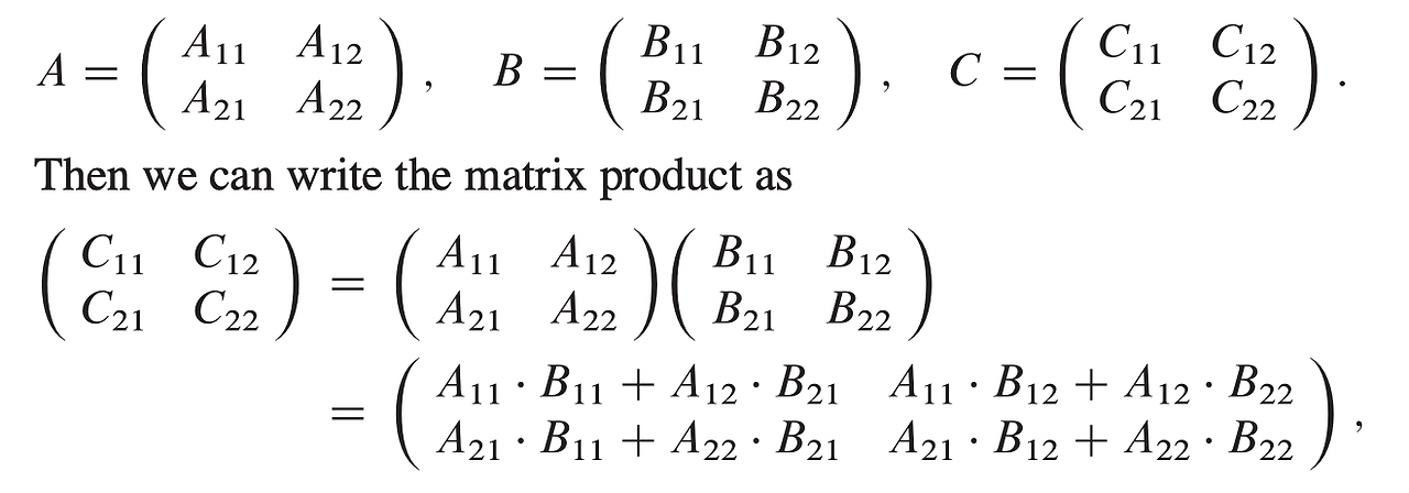- 원리를 간단하게 설명하면 행렬들을 부분행렬로 나눠서 곱하고 더하는 과정을 재귀적으로 반복하는데