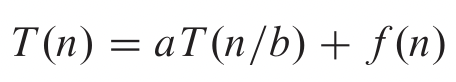 - a : 분할한 부분 문제의 수, b: 입력의 크기가 줄어드는 비율 , T(n/b) : 부분문제 해결 시간, f(n) : 병합에 필요한 시간
