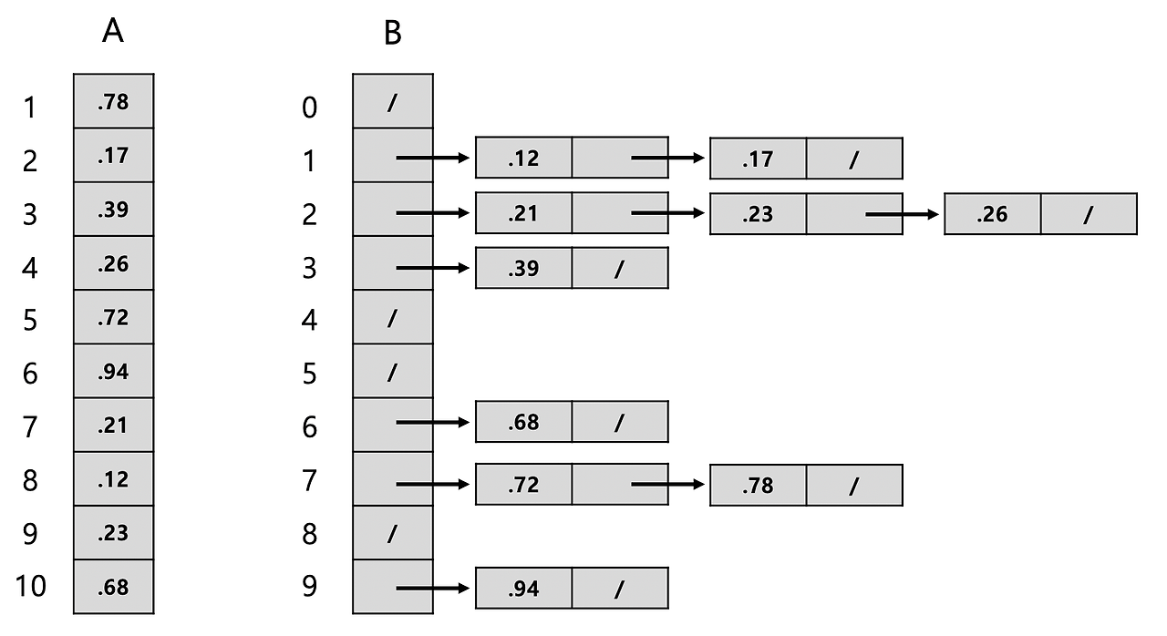 - 각 버킷 내부에서 정려한 후 각 버킷을 합쳐서 전체 데이터를 정렬하는 알고리즘이다.