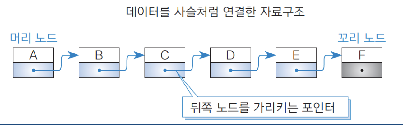 - 연결리스트는 각 노드가 데이터와 포인터를 가지고 한 줄로 연결되어 있는 방식으로 데이터를 저장하는 자료구조